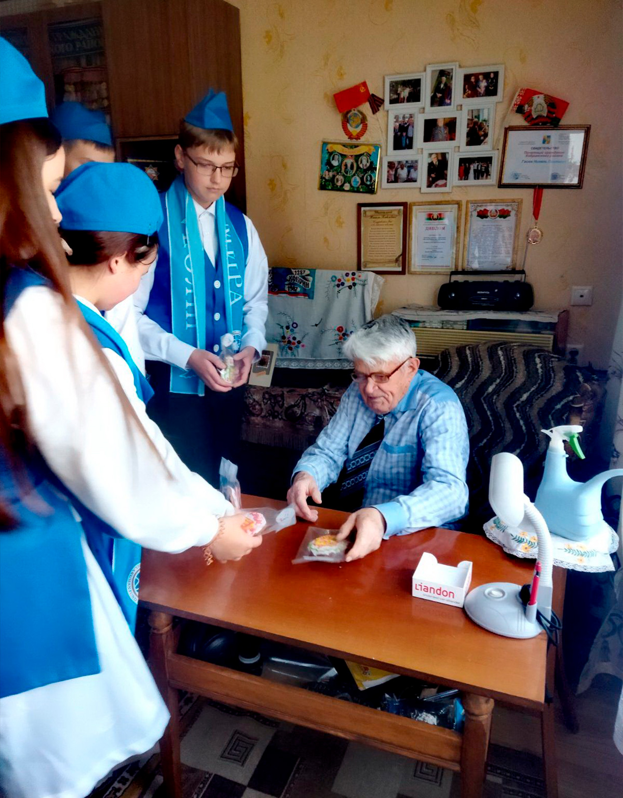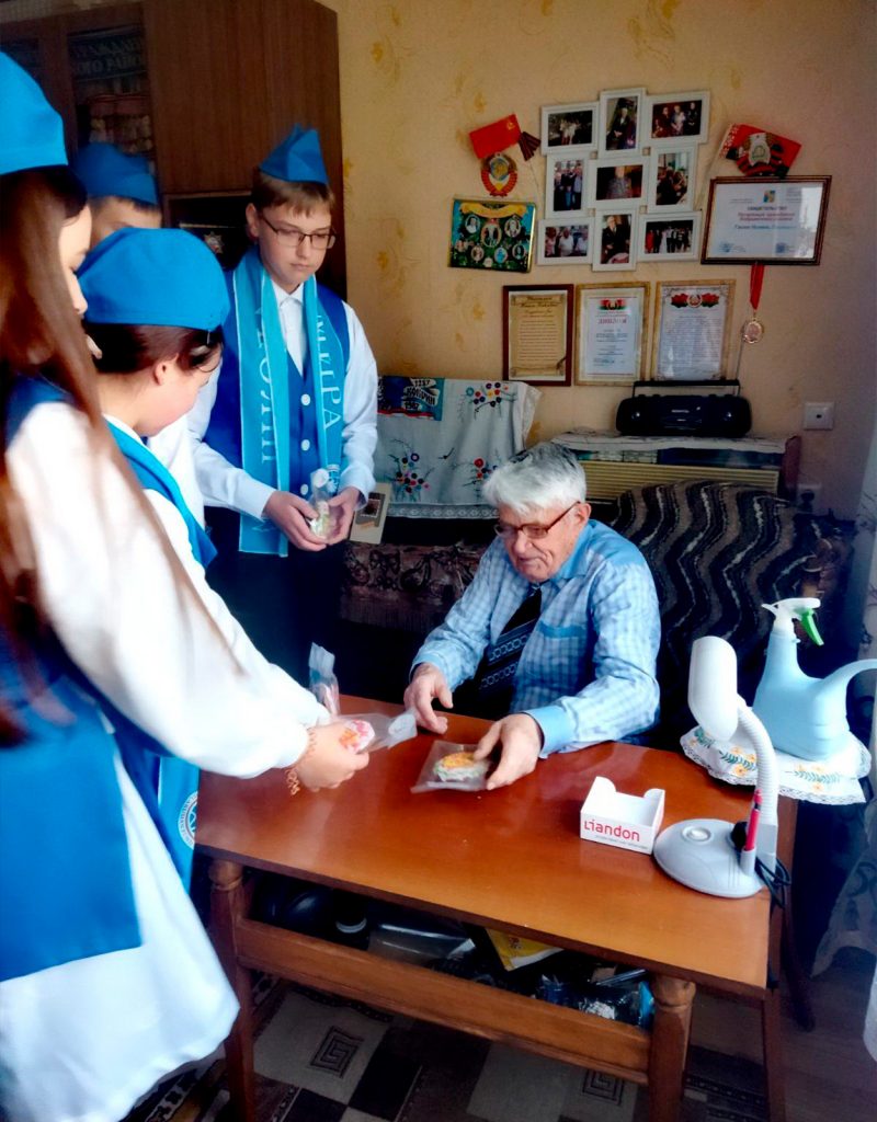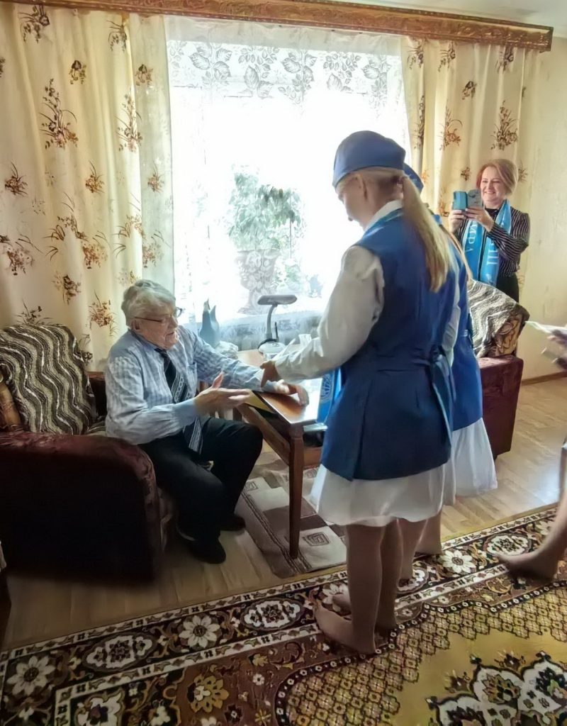 В прошлом году вместе с ветераном юные миротворцы отмечали его 100-летний юбилей, вместе посадили деревья на территории вокруг дома, в котором проживает Нинель Павлович, организовали сладкий стол. Прошел уже почти год, и ребята снова в гостях у заслуженного человека, Почетного гражданина г.Кобрина.