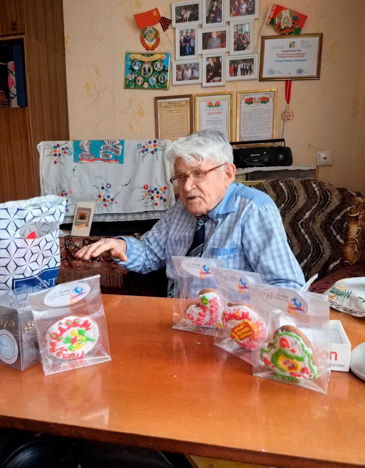 Один из адресов для поздравления – ветеран Великой Отечественной войны Гасюк Нинель Павлович. После войны Нинель Павлович длительное время работал учителем производственного труда и воспитал не одно поколение умелых трудолюбивых белорусов.