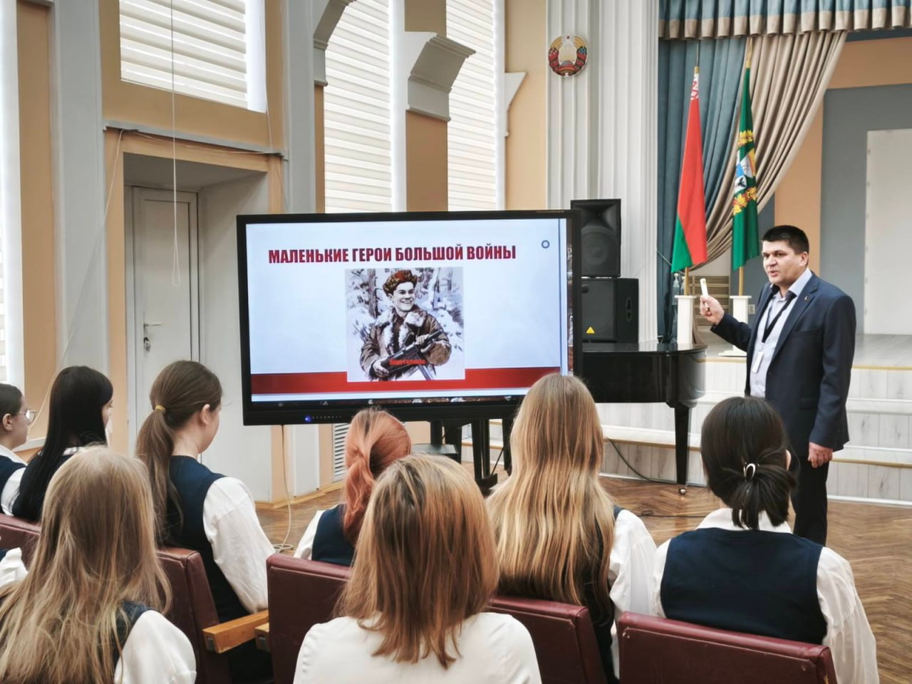 В пионерской дружине имени Зои Космодемьянской средней школы №75 г. Гомеля состоялся урок мужества «Героизм детей войны» с участием Маи Ващенко, старшего научного сотрудника государственного архива Гомельской области