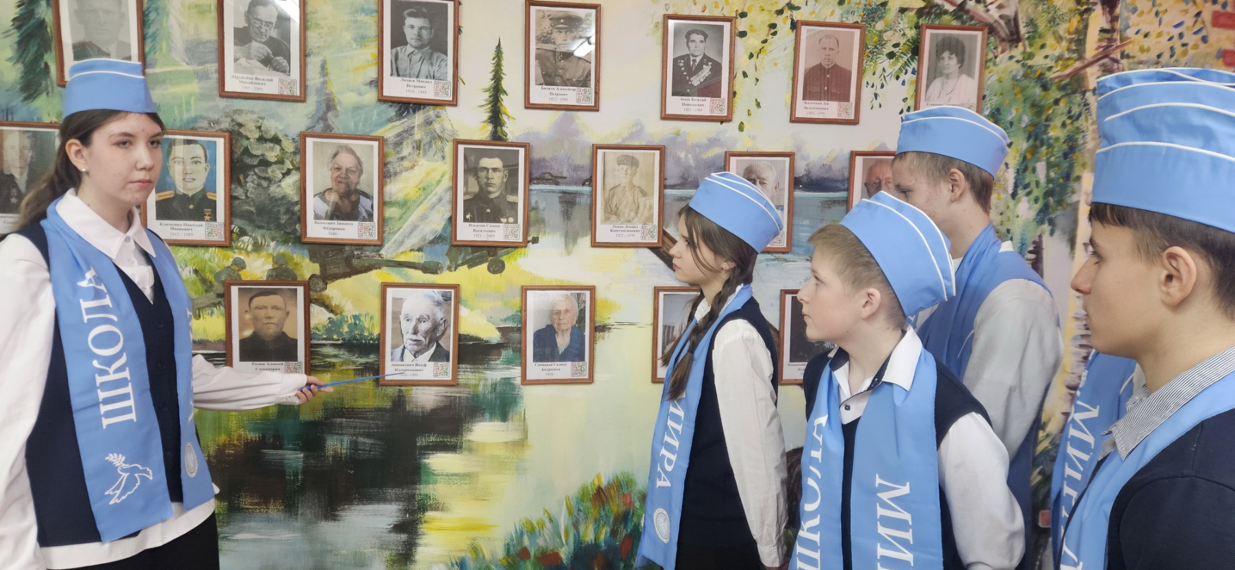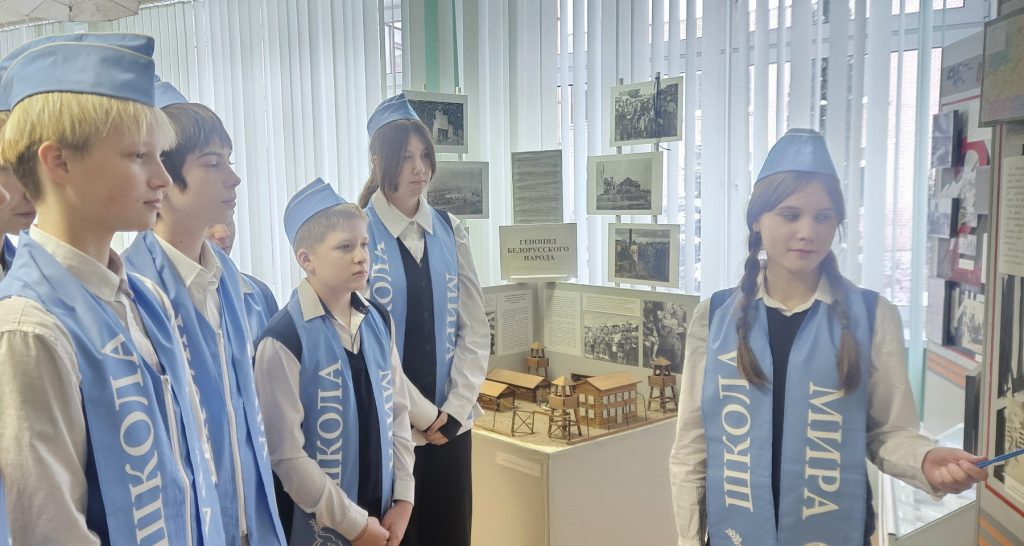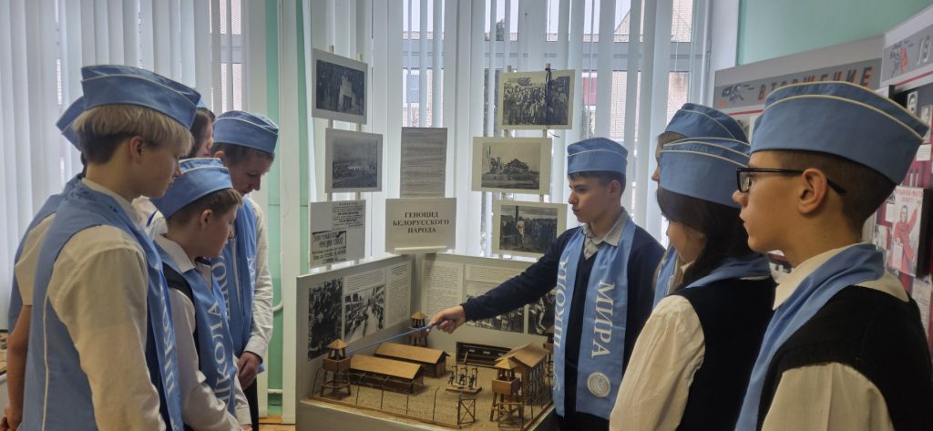 Рассказ о Холокосте, как попытке уничтожить все следы еврейской жизни, их дома, их традиции и культуру, завершился минутой памяти у экспозиции «Ваш подвиг жив, неповторим и вечен!». частью которой являются воспоминания малолетних узников концентрационных лагерей, собранные миротворцами школы для единого электронного портала «UZNIKI.BY», а также материалы об Анишкевиче. Й.И., награжденного медалью и удостоенного звания Праведника Народов Мира – прадедушки учащегося нашего учреждения образования. «Тот, кто спасал жизнь живого человека, подобен тому, кто спас целый мир…» — именно так говорят о людях, спасавших евреев от смерти, рискуя собственной жизнью во время войны.