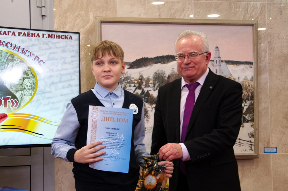 Литвин Ульяне, 16 лет, Минский педагогический колледж – Школа мира (эссе «Мост между двумя мирами»); Баракову Ивану, 17 лет, СШ № 197 имени Героев 120-й дивизии – Школа мира (нарыс «Удых-выдых»); Жаркову Владиславу (РФ), 19 лет, Белорусский государственный аграрный технический университет (эссе «Мы – дети эпохи…»); Ярочкиной Юлии Владимировне, 44 года, детский сад № 383 (ст-е «Неизвестному солдату»); Белой Марии Юльяновне, 63 года, детский сад № 486 (ст-е «Память отца»).