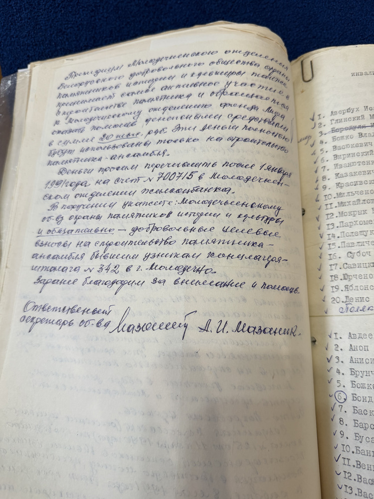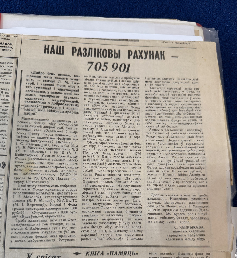 В архиве Молодечненской организации Фонда мира сохранился оригинал письма Мазаника А.И. и распоряжение начальника идеологического отдела горкома партии оказать содействие и подключить Минское отделение Советского фонда мира к этому грандиозному проекту.