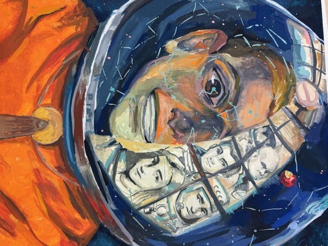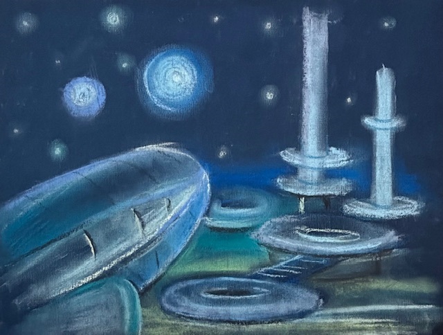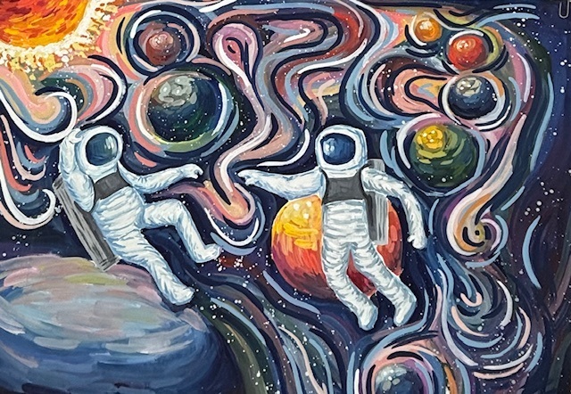 Часть работ представляет собой изображение космических аппаратов — ракеты, летящие сквозь звезды; дружелюбных инопланетян, героев-космонавтов; другая часть – видение Космоса, как пространства высокой красоты и знания: звезды в виде цветов, созвездия-животные, разноцветные космические туманности.
